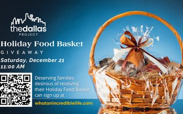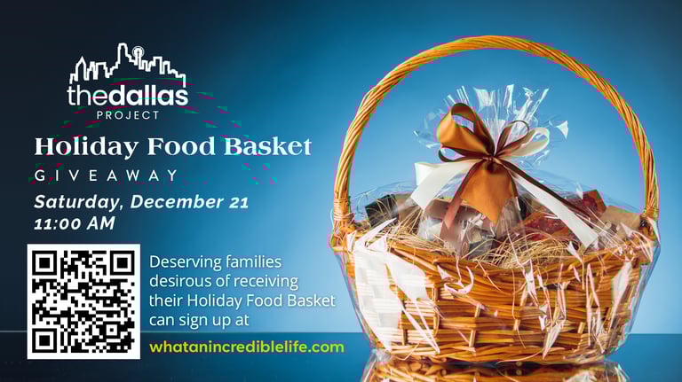 "The Dallas Project" Church Holiday Food Basket Giveaway is Saturday, December 21, 2024 at 11 AM. Deserving families desirous of receiving their Holiday Food Basket should signup by filling out the form below.